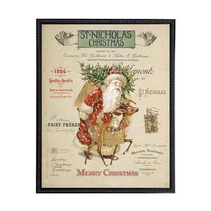This framed print features a painting of Santa against a distressed bookplate background. The artwork is sized at 19 inches by 25 inches and is presented in a black-beaded wooden frame with back-mounted hardware and glass encasing. Made in USA.