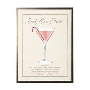 Bring a touch of festive charm and sweet indulgence to your home with this delightful watercolor print of a classic Candy Cane Martini and its recipe. The artwork features delicate watercolor brushstrokes and a vintage-inspired design that adds a touch of classic elegance to your dcor. The print is presented in a pewter-finished frame made from real wood, encased in glass to protect the artwork and provide a polished finish. It comes ready to hang with back-mounted hardware for easy placement. Made in the USA.