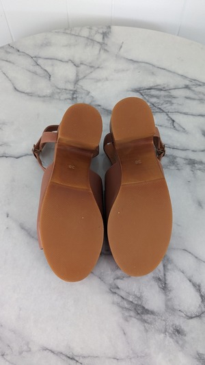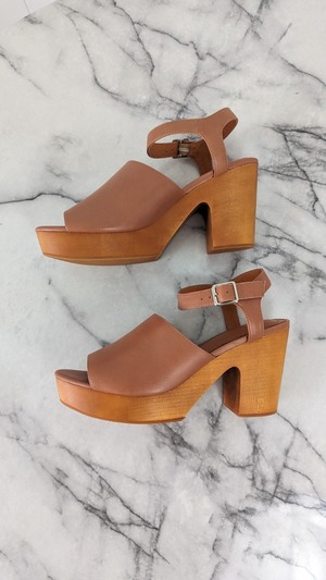 Brand new, without box. Never worn. No flaws. 1" platform 3.5" heel Material: leather upper, wooden platform Closure: adjustable buckle Features: open toe, memory foam cushioned insole