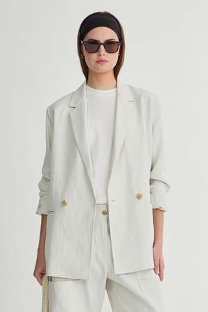- 77% Viscose 22% Linen 1% Elastane. Lining: 100% Polyester - Made in China. Fabric imported from Italy - Oversized, boxy fit, fully lined, double breasted button closure, slightly dropped shoulder, vented cuffs with button closure, besom pockets at front, interior chest pocket, vent at back hem - Dry clean only - Oversized fit. Option to size down for a slimmer look - Model is 5'10 and wearing a size 4