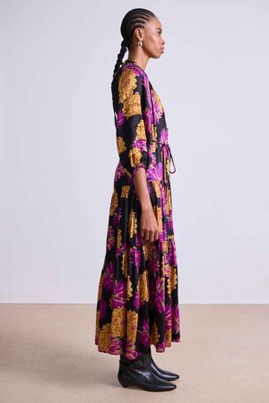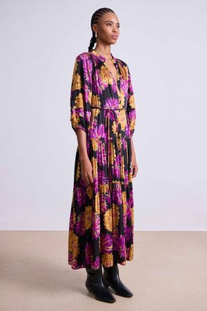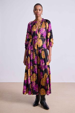 The Noto Maxi Dress by Apiece Apart features a center front slit, front button placket, tiered skirt, flowy silhouette, 3/4 length sleeves, and a removable self-tie belt. Crafted from 100% organic cotton. Hand wash cold, lay flat to dry, or dry clean. Measurements from size S: Length 53" from shoulder. Fits true to size. Select your usual size. Model is 5'10" and wearing a size small. A staple maxi silhouette, complete with a voluminous tiered skirt, neck ruffle, and subtle pleat detailing on the sleeve. Made in India.