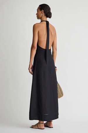 - 100% Linen - Made in India - V-neckline, maxi length, adjustable tie straps, twist front detail, A-line silhouette, center back zip closure, optional hook and eye at neckline for more coverage - Dry clean only - Fits true to size. Select your usual size. - Model is 5'10 and wearing a size small