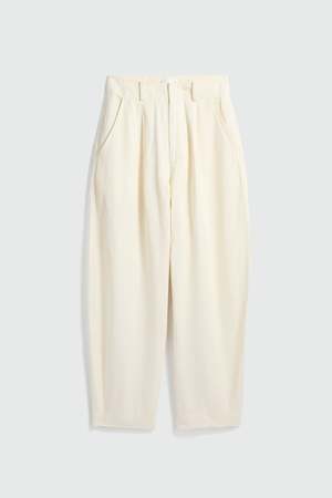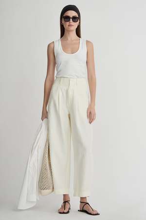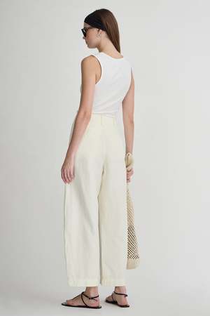 60% linen, 40% organic cotton. High waist, cropped barrel leg with hook and bar closure and slant pockets. Size 4 front rise: 10 3/4". Standard inseam: 27". Petite inseam: 24".