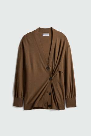 A lightweight layering essential designed with effortless versatility. The Drippy Tissue Cardigan features a relaxed silhouette with a classic V-neckline and four-button front closure. An additional button at the left side waist allows you to create a subtle cinched shape for a modern, draped look. Details: - V-neckline - Relaxed fit - Four-button front closure - Extra button at left side waist for optional cinched styling Fabric: 100% Merino Wool Fits true to size. Color: Desert Palm Care guide: Dry clean only.