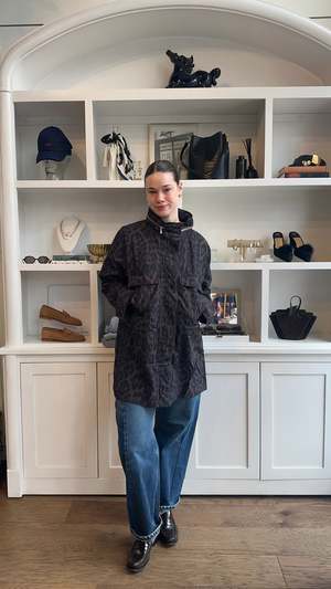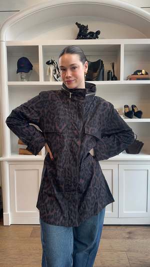Leopard-pattern rain jacket in a dark leopard colorway.