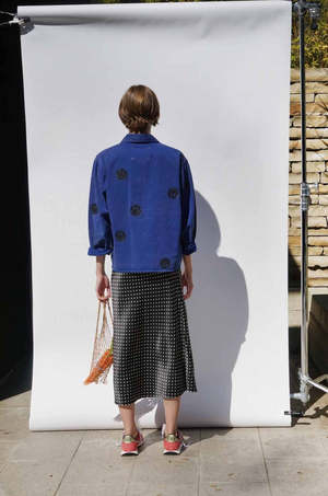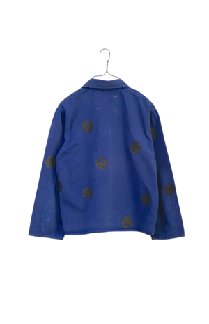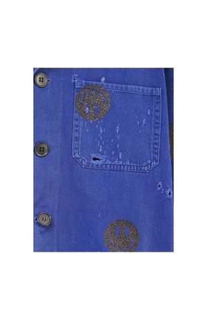Vintage French chore jacket with allover black sparkle smile face are hand applied to create an all over polka dot effect. 100% cotton - vintage jacket is hand selected for its unique character and wear. Holes, stains and wear marks may be present and are intrinsic to the beauty and unique character. Measurements: Chest 22" Length 24"