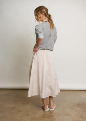 Diors 40's New Look inspired this modern full flared skirt. We cut her from a heavy blush Italian nylon twill, added side pockets (of course), a comfortable but chic wide elastic waist and a delicate baby hem. Sneakers, slippers or boots will change the mood in minutes. 100% Italian Nylon Twill - Dry Clean or Machine wash Small Batch made in Romania | Imported Fabric from Italy Model is 5'8 and wears a size 1