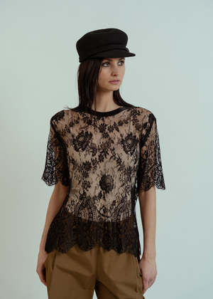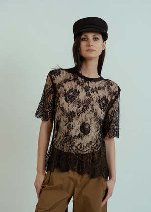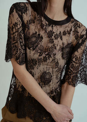 Aquarius Cocktail's French Lace Tee is an up-cycled lace tee trimmed with silk binding at neck and scalloped edges. No two are alike. Details - Vintage lace tee. - Silk binding at neck. - Scalloped edges. - One-of-a-kind. - Hand wash. - Made in Los Angeles. Color: Black. 100% nylon with silk trim.