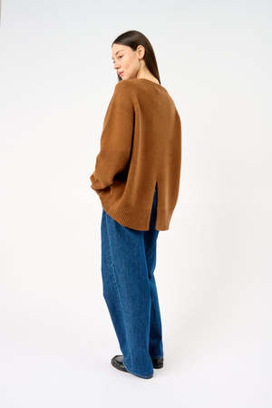 The Bredin Sweater is a heavy-weight, opulent chunky-knit cashmere crew neck jumper, chosen for its remarkable softness and rich texture. It features a ribbed neckline, cuffs, and a high-low hem, with an oversized, one-size-fits-all silhouette and fully fashioned seams, highlighted by a split at the center back. Material: 100% GOTS-certified cashmere. Color: Mahogany. Size: One size. Care: Dry clean only. Designed in Chelsea, London.