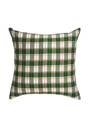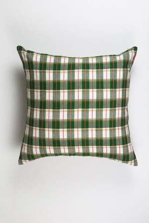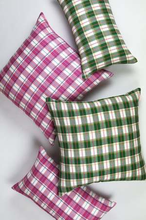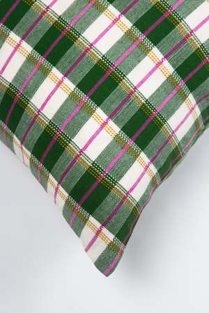 Green & white plaid pillow, ethically handwoven by artisans in Chiapas, Mexico on traditional footlooms. With hints of hot pink and ochre, this updated classic plaid will be a lively addition to any decor.