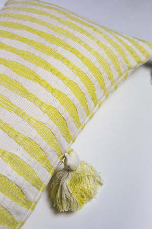 Our easiest, best selling style, now in a naturally dyed super washed yellow and off white stripe. This handwoven textile was made in partnership an artisan group just outside of Antigua, Guatemala. Due to the hand-dyed nature of this product, each piece may differ in hue, tone and tie dye pattern. 100% cotton. 12" x 20". Zipper closure. Dry clean only. Size 18" x 18" is made to order. Size 20" x 20"is made to order.
