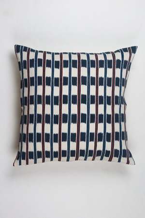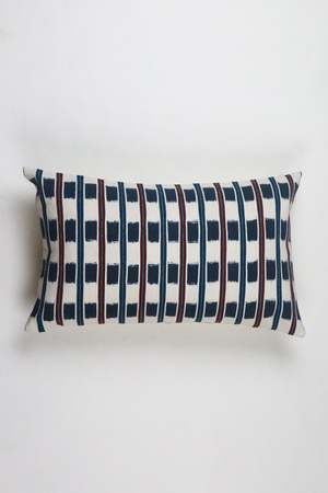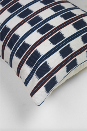 This textile was woven by an artisan from the lakeside village of Santiago Atitlan, Guatemala, using a time honored traditional method of weaving called the back-strap loom. This pillow features an intricate Guatemalan tie dye technique jasp. This particular jasp design is specific to Santiago Atitlan. This pillow was made in partnership with a non-profit organization on Lake Atitlan, Guatemala. Pictured here, in the Brooklyn home of Christine Barberich. Sizes 12" x 20" and 20" x 20" are both