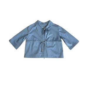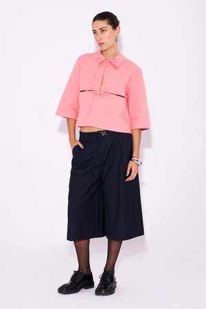 The Jump Blouse is a cropped top with wide sleeves, a tie front, and an embroidered back neck. Please note: model photos are for style reference only; this listing is for the blue Petrol color. Made by ARCS in London. CONTENT & CARE: 100% Cotton.