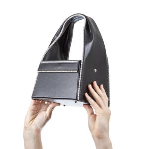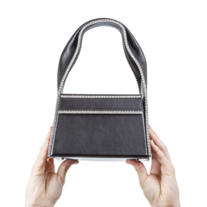 Founded in 2014 by designers Beckett Fogg and Piotrek Pansczczyk in downtown New York City, AREA is a womenswear and accessories design studio specializing in quality craftsmanship, textile development and innovative embellishment, since its launch, AREA has generated a cult following with their modern and timeless take on beauty and glamour. Crystal trimmed leather lunch box bag with magnetic closure featuring a folded handle. Material: Calf Leather Made in Italy