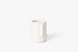 A stackable mug with three-dimensional sculptural shapes, designed to replace the traditional mug handle and save space in your cupboard. Each shape is intentionally placed with balance and comfort in mind. Mug holds 12 oz. of your favorite beverage. Material: glazed stoneware Dimensions: 3 x 3 x 4.