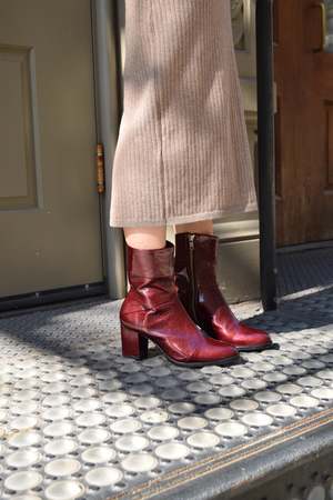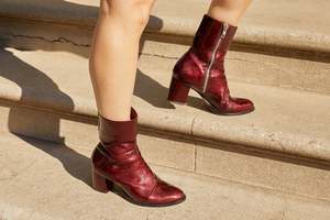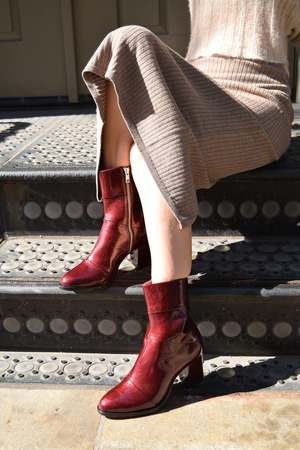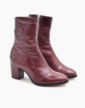 Our new Carmen boot is made of genuine leather in patent crinkle with inside zip. Supple leather lining, buff leather sole with good year welt sole stitch. The boot features a memory foam footbed and 2" heel. A chic piece to add to your favorite boot collectsion. Ethically handmade in Brazil.