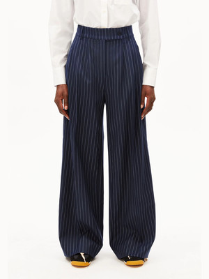The Pinstripe Kaayua Pants feature a high waist and long, wide leg. The medium-weight woven fabric made from TENCEL Lyocell shows a fine pinstripe pattern, while pleats and side pockets give the design a clean, structured line.