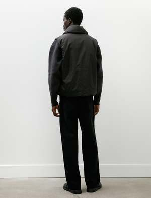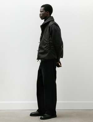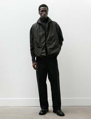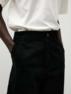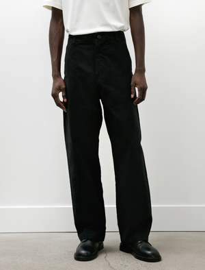 Wide fitting, straight legged trousers cut from a high density French moleskin in a garment dyed black. Feature a zip fly, a two-point button closure, front slash pockets, and rear patch pockets. The generous leg tends to sit away from the body while side-seamless construction allows the silhouette to hang freely from the hips with a sense of column-like volume. Completed with fine herringbone pocket bags and low profile seams for a smooth interior finish.