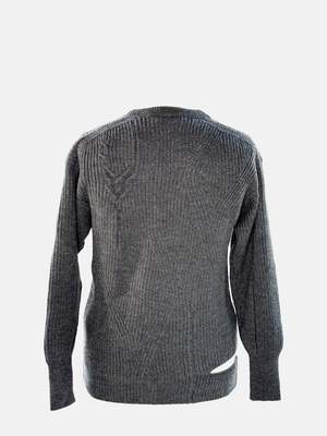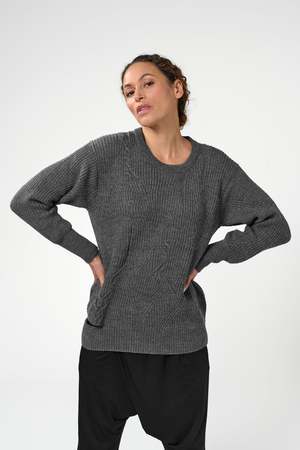 DETAILS This Merino Asymmetric Crewneck is our take on an updated, modern fisherman sweater! Relaxed fit, with a bottom rib slit at wearer's right. This peekaboo detail can show the contrast color of your garment underneath. Hits the low hip for length. Our unexpected engineered rib and cable layout moves around the body, is medium weight and made from luxurious, sustainable RWS certified Italian merino yarn. You will own this garment for years to come! 100% Superfine Merino, Made in Italy of yarn spun and dyed in Italy with low environmental impact dyes Gently hand wash in cold, do not bleach, lay flat to dry, warm iron, can be dry cleaned without PERC
