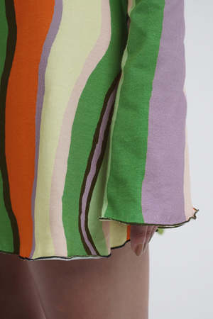 A bold mini dress - Wear on its own or try it styled with bike shorts or straight leg jeans - Longline, flared sleeves - Fitted through the body with an a-line skirt - High neck - Lettuce hems - Jersey knit made from bamboo and spandex - Hand wash, hang to dry Michela is 5'4" and wears size 6.