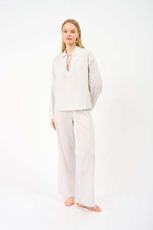 The Santiago Top from Asceno is made from a soft cotton-viscose blend in a timeless stripe. It features a tied V-neck detail. Material: 78% cotton, 22% viscose. Color: Blue stripe. Made in Portugal. Care: Cool wash or dry clean. Fit: Fits true to size, take your normal size.