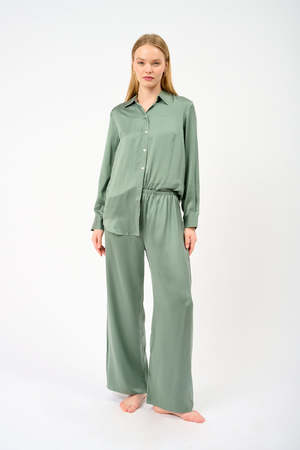 The Austin trouser from Asceno has a wide-leg silhouette with a drawstring elasticated waist and a slightly cropped length. The classic Sage trousers are made of lightweight silk twill and pair well with the Tulum cami for a coordinated appearance that can be dressed up or down. Material: 100% silk. Color: Charmeuse Sage. Details: Elasticated waistband. Care: Hand wash or dry clean. Made in China.