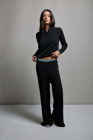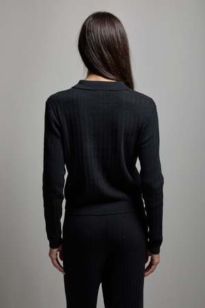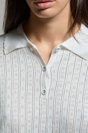 The Presley Pointelle Polo by Asher features a classic silhouette with an airy body and slightly fitted sleeves. The pointelle construction offers a feminine touch to an already iconic garment. This sweater knit pointelle is thoughtfully engineered in a 100% cotton yarn, featuring a daisy and pinstriped repeat with ribbed and scalloped edging, finished with covered buttons. Casey wears a size small.
