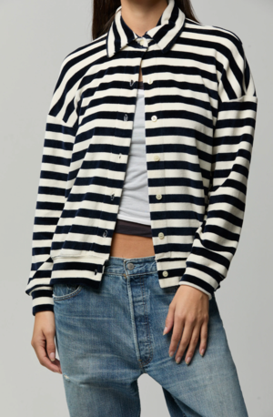 A modern take on the classic striped cardigan. Crafted in plush cotton velour with a smooth, light-catching finish, the Teri feels incredibly soft while holding its shape. The structured collar and clean button front give it definition, while the relaxed silhouette drapes without adding bulk. Pairs with the Sandy Short. Casey wears a size small. Fit runs true to size. Designed in Los Angeles.