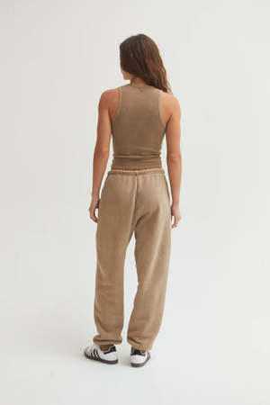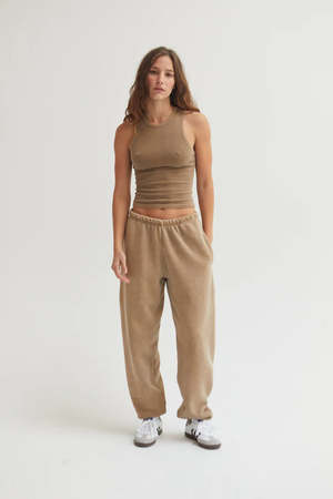 The Sebi Sweatpant in brown latte by Asher features a relaxed fit and is crafted from heavy cozy fleece. Details include side seam pockets and an elastic waistband with cord drawstring. Garment-dyed and enzyme & silicon washed for a soft hand feel. From yarn to garment, made in LA. L505-F05