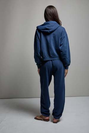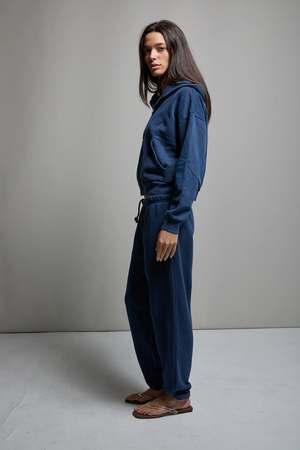 Asher Sebi sweatpant in cadet blue. Relaxed fit, featuring a heavy, cozy fleece. Side seam pockets and an elastic waistband with cord drawstring. Pair with the Rosie hoodie for a matching set. 100% cotton cloud fleece. Garment-dyed and enzyme and silicon washed for a soft hand feel. The model wears a size M. Fit runs oversizedif between sizes, we recommend sizing down. From yarn to garment, made in LA. L505-F05