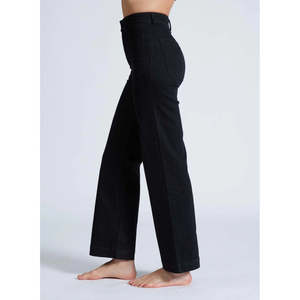 The Sailor Pants by ASKK NY feature a classic silhouette with a high rise, relaxed wide leg, and iconic sailor pocket details in a dark Black Resin wash. Size Details 12" rise / 30" inseam / 20" leg opening Materials & Care 98% Cotton / 2% PU; 11oz Japanese Denim Machine wash cold separately; do not tumble dry Made in Los Angeles. Lary is 5'7" wearing a size 25 with the classic tee size 1.