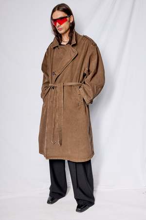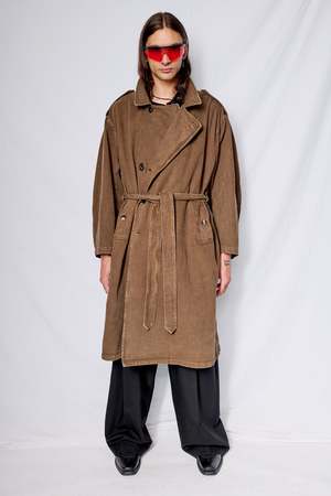 The Canvas Overdye Trench Coat from Assembly New York features a double-breasted button front closure, shoulder epaulette and belt detail, and button strap adjustable cuffs. Made from custom processed denim fabric with a washed, vintage feel. Relaxed fit with unisex styling. - 100% Cotton - Made in USA