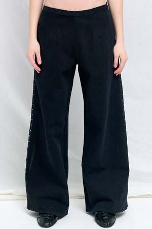 Black Denim Side Hook Clean Pant from Assembly New York. Wide, straight-leg pant in cotton denim fabric. Hidden zipper back closure, two front pockets, and darting at the front and back for a tailored fit at the waist. Functional metal side hook detail along the leg for convertible styling. 100% Cotton. Made in USA.