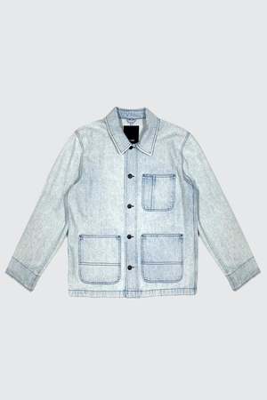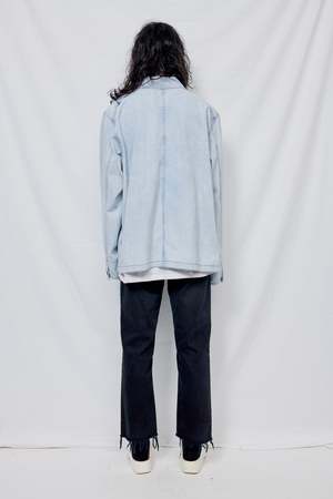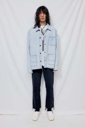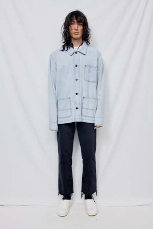 Light Acid Wash Overdye Denim Field Coat from Assembly New York. Button front closure. Two front patch pockets. Single chest pocket. Relaxed fit. - 100% Upcycled Cotton - Made in USA - Naoki is 6'2 with a 29" waist, shown in size large MEASUREMENTS IN INCHES XS S M L XL BODY LENGTH 27 1/2 28 1/2 29 1/2 30 1/2 31 1/2 ACROSS SHOULDER 18 18 1/2 19 19 3/4 20 3/4 CHEST (1" BELOW ARMHOLE) 44 3/4 46 3/4 48 3/4 51 3/4 55 3/4 BOTTOM SWEEP 44 3/4 46 3/4 48 3/4 51 3/4 55 3/4 SLEEVE OPENING 9 3/4 10 10 1/4 10 1/2 10 3/4 SLEEVE LENGTH 24 1/2 25 1/2 26 1/2 27 1/2 28 1/2