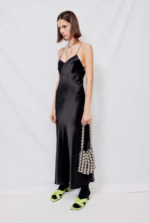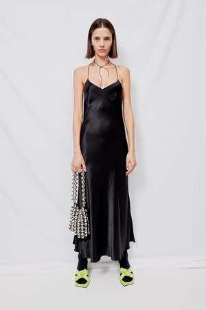 Black Satin Bias Strap Dress from Assembly New York. Low back with criss-cross straps. Side zip closure. - 47% Viscose / 53% Rayon - Dry Clean Only - Made in NYC - Makelly is 5'9 and wears a size 2, shown in size small MEASUREMENTS IN INCHES XS S M L BODY LENGTH 44 8/16 44 12/16 45 45 4/16 CHEST (1" BELOW ARMHOLE) 29 8/16 30 8/16 31 8/16 32 8/16 WAIST (6" BELOW CHEST) 27 8/16 28 8/16 29 8/16 30 8/16 HIPS (7" BELOW WAIST) 36 8/16 37 8/16 38 8/16 39 8/16