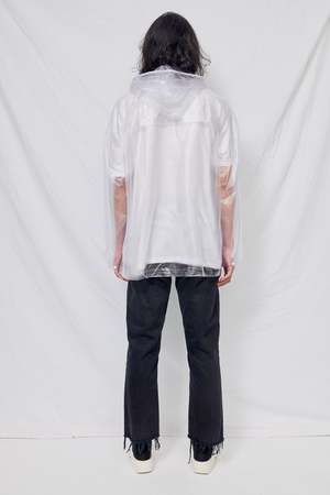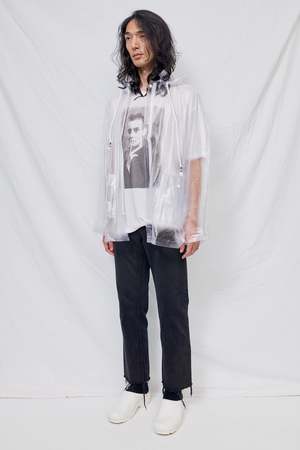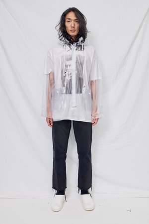 Unisex vinyl clear raincoat from Assembly New York. Covered zip closure. Front flap pockets with snap button closure. Removable protective hood with drawstring adjustment. Relaxed fit, unisex styling. - 100% Vinyl - 100% Waterproof - Made in USA - Naoki is 6'2 with a 29" waist, shown in size L. Shown with Assembly White Sinead T-Shirt and vintage jeans (variations available to purchase in-store).