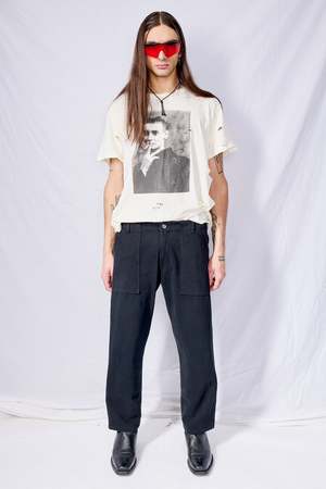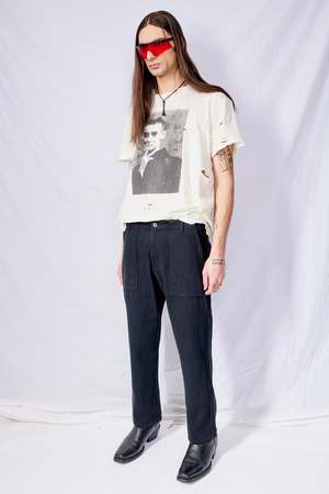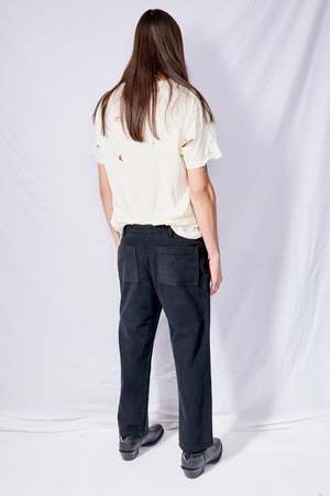 Black Overdye Denim Vietnam Pant from Assembly New York. Front patch pockets. Back flap pockets. Belt loops along waistband, zipper and metal button front closure. Elasticated waistband along the back for comfort fit. Custom processed heavy duty denim. Soft, worn-in feel. - 100% Cotton - Made in USA - Mason is 63 with a 30 inch waist shown in size L with Assembly Distressed White Sinead T-Shirt and custom boots. SIZE WAIST INSEAM OUTSEAM S 30" 27" 36" M 32" 28" 37.5" L 34" 28" 38.5"