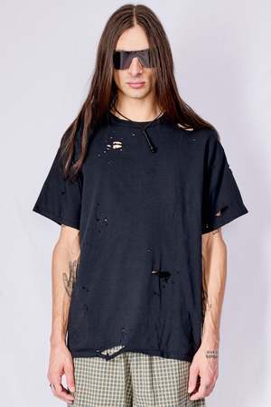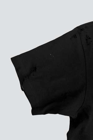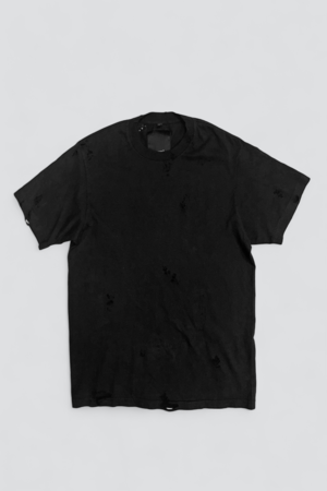 Distressed Black T-Shirt from Assembly New York. Soft, worn in feel. Ribbed crew neckline. Relaxed fit. Hand distressed in NYC, each piece is similar but unique. - 100% Cotton - Machine wash cold, air dry - Made in USA