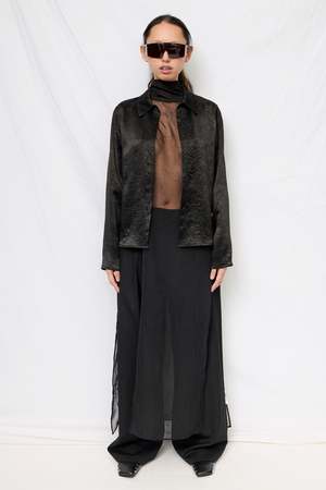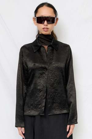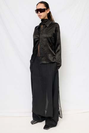 Black Wrinkled Acetate Fitted Button Up from Assembly New York. Long sleeve collared top in pressed sheen fabric with snap button front closure. 100% Acetate Made in USA.