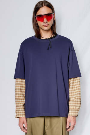 The Navy/Yellow Plaid Combo Long Sleeve Shirt from Assembly New York features a boxy fit and slightly cropped oversized silhouette. This crewneck top has mixed fabric sleeves, double stitched hemlines, and button cuffs. Fabric: 85% Cotton / 10% Polyester / 5% Spandex. Made in USA. Mason is 63 with a 30 inch waist, shown in size XL. Syd is 59 and wears size 2, shown in size M.