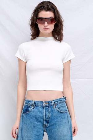 White Slim Fit Mock Neck T-Shirt from Assembly New York. 46% cotton / 46% viscose / 8% spandex. Made in USA.