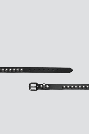 Black Leather Dome Stud Belt from Assembly New York. Genuine oil tanned leather, custom stainless steel dome studs. Thin, perfect for layering over shirts and dresses, or worn traditionally through trouser belt loops. Unisex styling. - 100% Leather - Silver hardware - Width: 0.75"