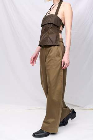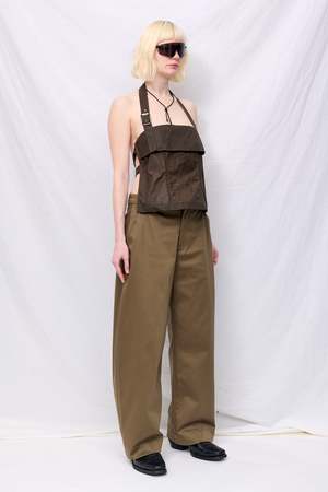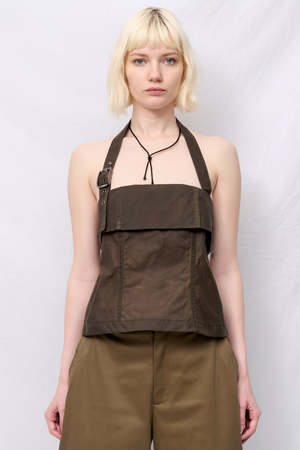 Brown Wax Strap Halter Top from Assembly New York. Halter top in durable, tear-resistant fabric, with an adjustable belted neck strap and two snap straps for back closure. Front panel construction; can be worn alone or as a vest top. - 100% Cotton - Made in USA