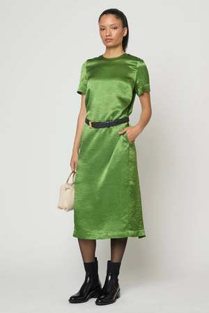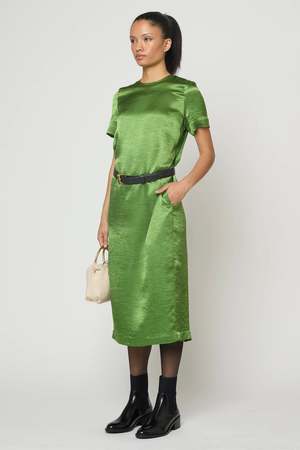 The Simone Dress is a short-sleeve, seasonless piece crafted from crinkled satin. With a boxy column silhouette, crewneck, and back zipper closure, it offers effortless, versatile styling from day to night. - Boxy column silhouette - Short sleeves - Crewneck - Back zipper closure Fabric Notes 100% Polyester (recycled) Dry clean only Made in USA Model is 510" and wears a Small.