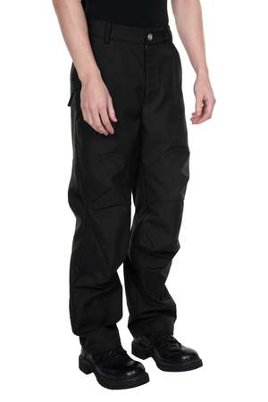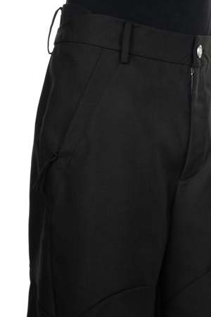 ATTEMPT reconstructs different styles and elements to create a new aesthetic system. By taking a more experimental approach to creation and production, which involves an understanding of the past and the current form of society, Attempt is creating an aesthetic form that is anchored in the present but different from it. It must ultimately be a product that cannot be defined as seen with the Deep Black Green Slanted Pants. Button closure at waist. Two side pockets. Slanted. Invisible zips throughout. Black/Green Details. Colour: Black/Green. Composition: Poly
