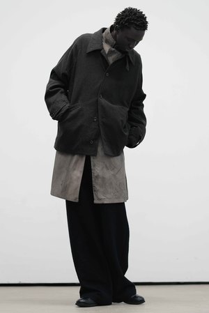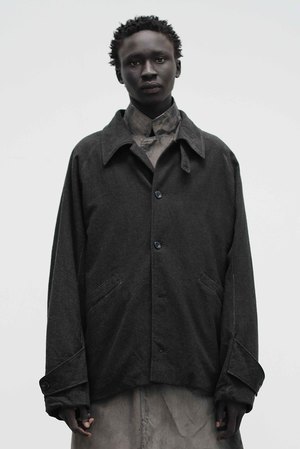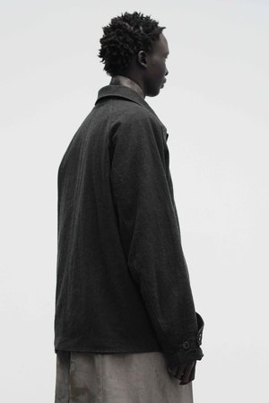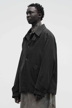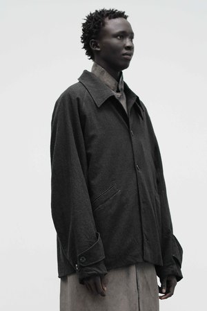 Wool cotton jacket with raglan sleeves and dropped shoulders. Features long sleeves, a regular collar, two side pockets, button closure at front, buttoned cuffs, and horn buttons. Made from a soft textural wool cotton fabric. Colour: Gray Green. Composition: Wool Cotton.