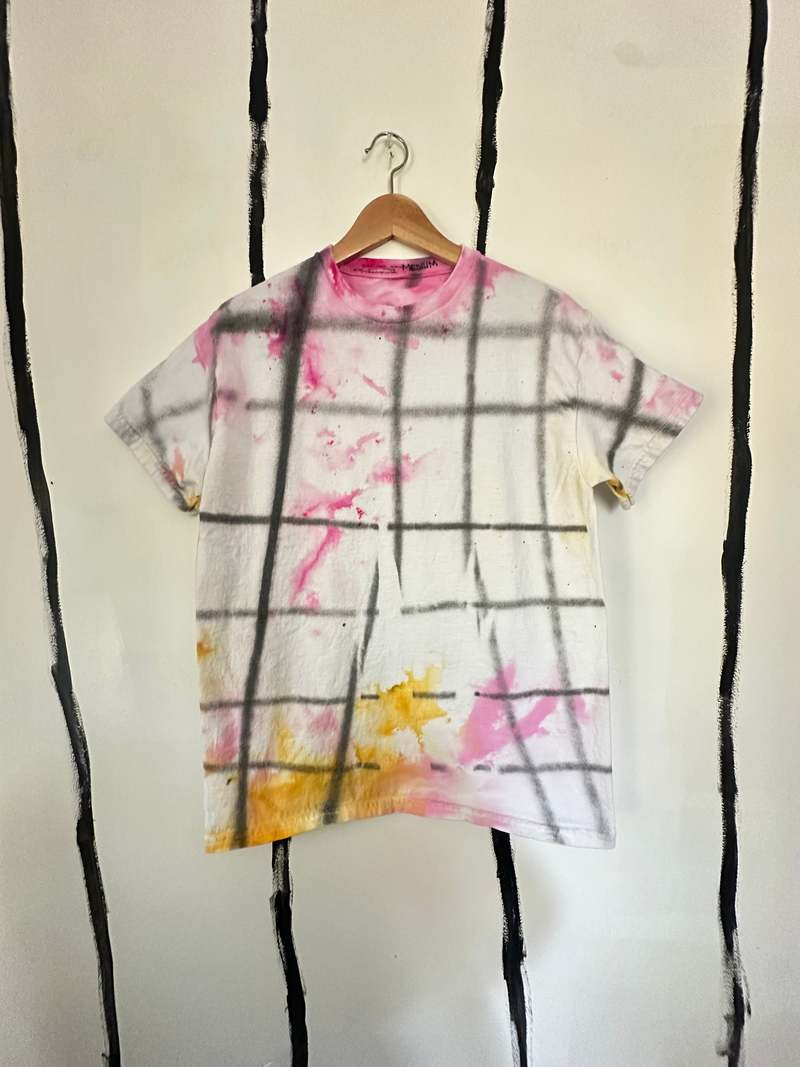 A classic-fitting USA cotton T-shirt, hand-dyed with materials that are good for you and then airbrushed in a rad plaid pattern. One of a kind.