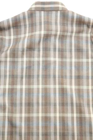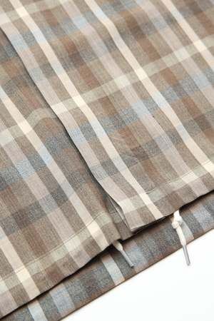 A tropical wool fabric made from Super 130s fine wool top single yarns, spun into multicolored melange threads and woven into a panel check pattern. 100% Wool. Made in Japan.