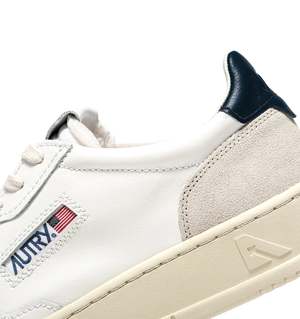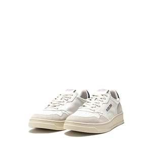 Reimagined with modern proportions and high quality materials, Autry's Medalist sneakers brings a contemporary twist to '80s tennis shoes. This women's sneaker is crafted in soft white leather with a supple, genuine look and feel, enriched with beige suede panels that lend the design a distinctive finish. The blue leather heel tab is branded with the Autry logo2. - Leather and suede upper - Perforated toe - Flat cotton laces - Label sewn on tongue - Padded ankle collar - Lined in leather and cotton terry - 2 cm leather insole - Rubber sole - Upper Material: 70% cow leather; 20% cow suede leather; 10% nylon - Lining: 40% pigskin; 50% towel; 10% nylon - Outsole: 100% rubber