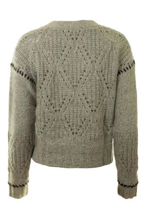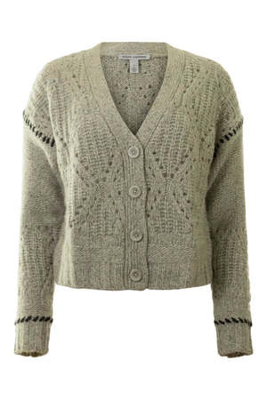 V-neck Autumn Cashmere Cardigan Sweater. Has Contrasting Stitching on cuffs and shoulders a Diamond knit Pattern. four button closure - 100% Cashmere - Dry Clean Only - Shade: Pebble/Pepper